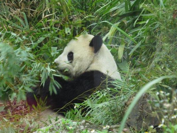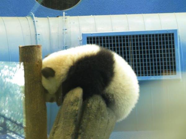 開放圓仔參觀後,已去過動物園兩次,然圓仔活動力很差,九點半之前就進館觀看,第一次母女均在睡覺,這次圓仔睡在木幹上,而圓媽則大享美食。但隊伍持繼前進中且玻璃反射,無法拍到清楚熊貓,還是館外的圓爸較好拍些。