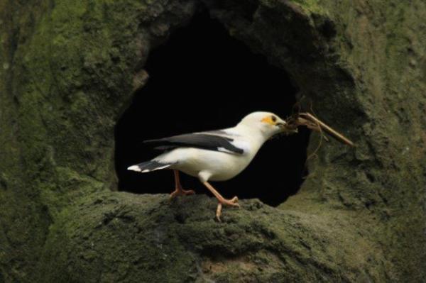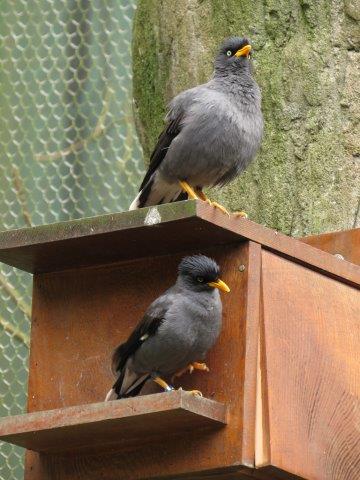 黑袖椋鳥想竹巢,看看此洞太大,八哥看穿其洞機,兩隻八哥趕回巢,不讓黑袖椋鳥竊佔。
