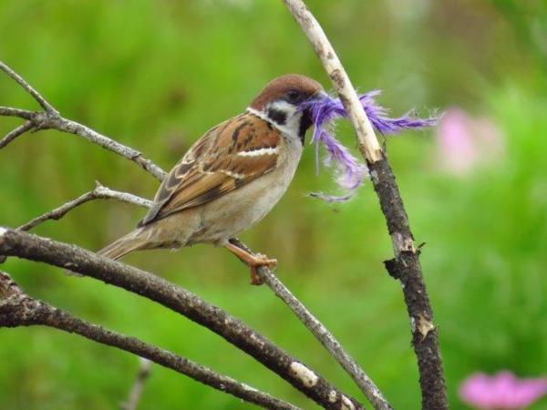 一到咖啡園前,飛來麻雀咬一團紫毛,哇!它也要築紫色巢嗎?