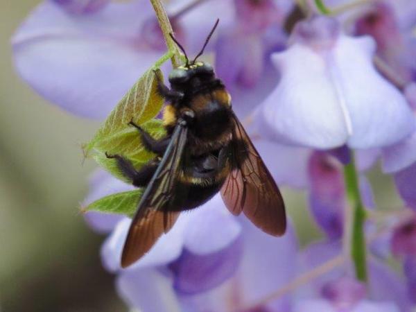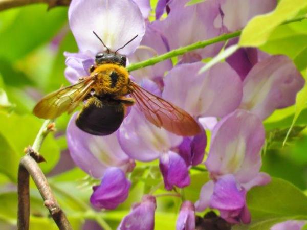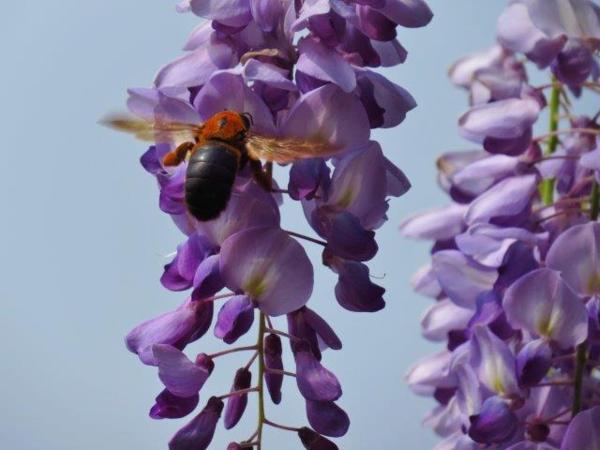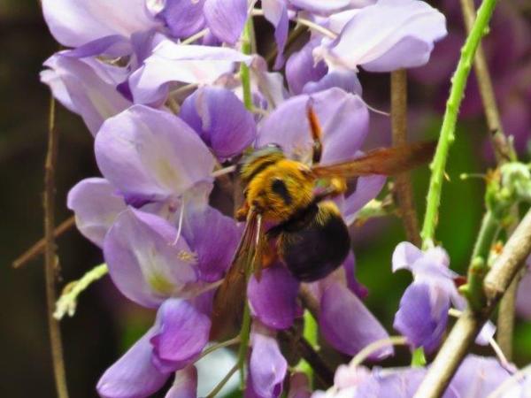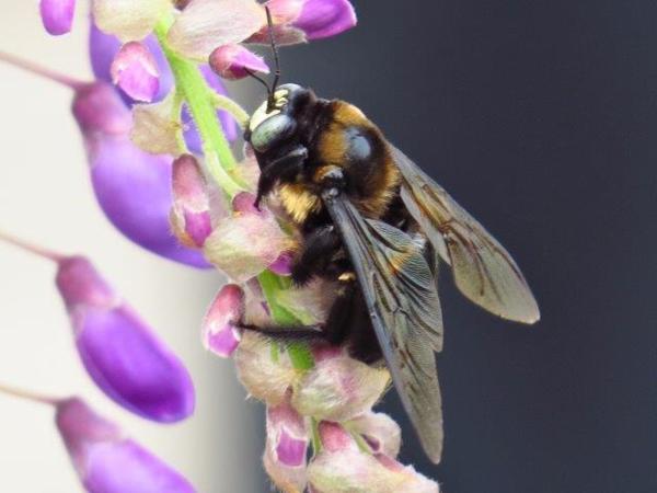 一入園內紫花叢內大黑蜂(第一次見到此昆蟲,在花叢中採蜜的都被我認為是蜂)不停飛於紫花間,另一種棕黑蜂則較常見到。