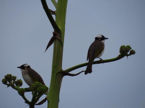 耳邊不時傳來鳥鳴聲,看到了兩隻停於龍舌蘭上白頭翁。