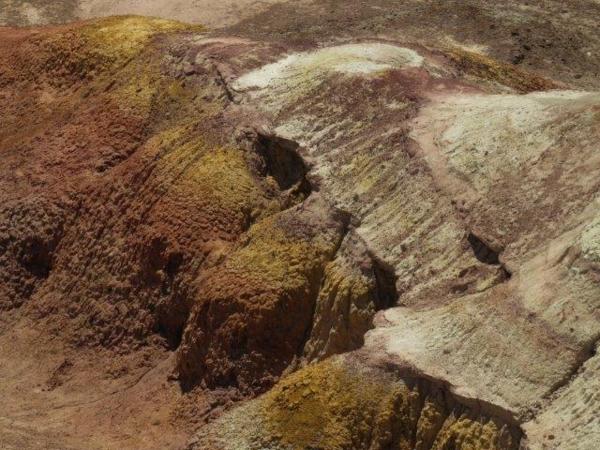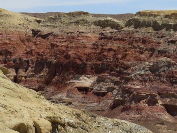 五彩灣風景乃五彩城區域,五彩灣處在準噶爾盆地東南部廣大的沙漠地帶,是千百年來地殼的運動,形成極厚的煤層,後幾經滄桑,覆蓋地表的沙石被風雨剝蝕,使煤層暴露,在雷電和陽光的作用下燃燒殆盡,形成了這光怪陸離的自然景觀。由深紅,黃,橙,綠,青灰,灰綠,灰黑,灰白等多種色彩的泥,葉岩互層構成的低丘群,起伏地貌,奇峰怪石,千姿百態。