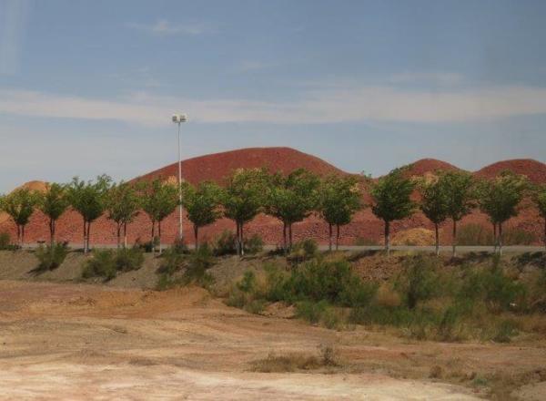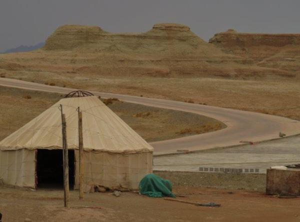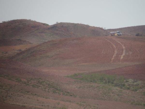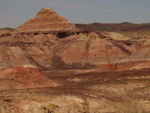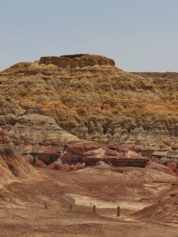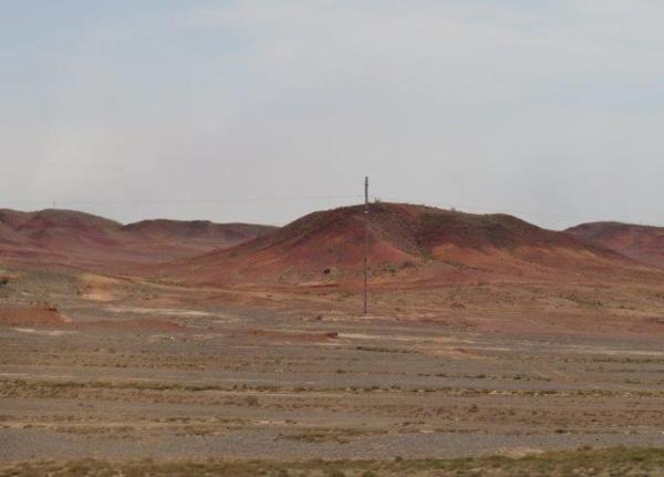 火燒山實際上是位準葛爾盆地東部的一處紅色丘陵區,最大的特色在於衆多和緩起伏的小山均由磚紅色和桔黃色岩石構成,紫色砂礫岩構成,呈赭紅色。我們並沒有下車參觀,而是我喜歡在車上觀賞窗外風景,經過時所拍。