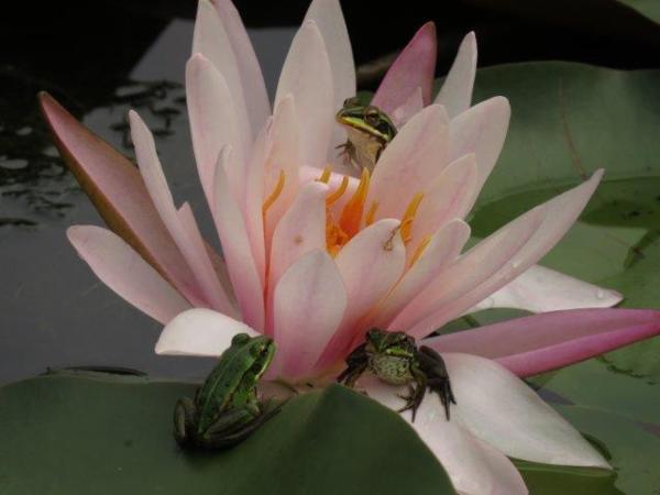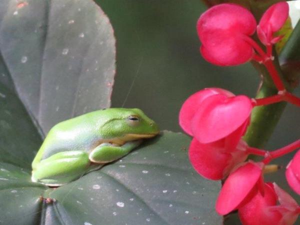最驚喜是看到樹幹上停歇著一群蛾、三隻蛙停在一蓮花上和台北樹蛙