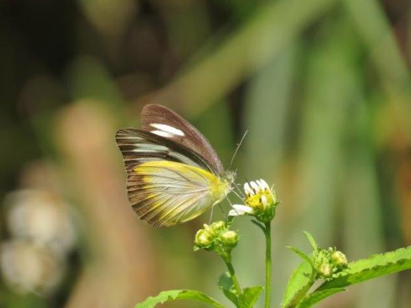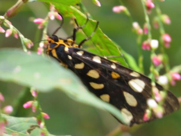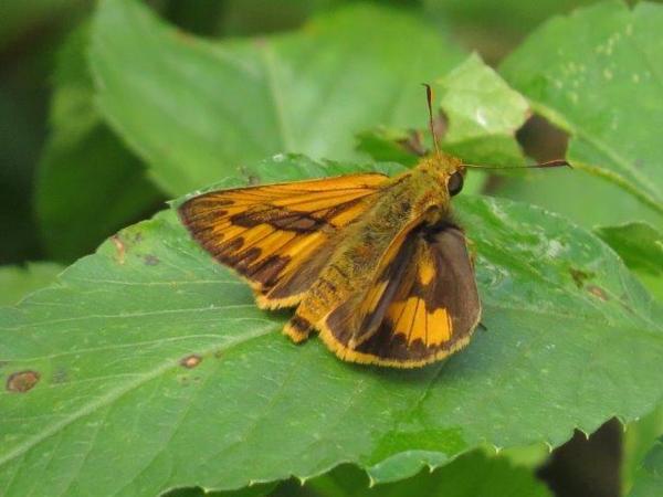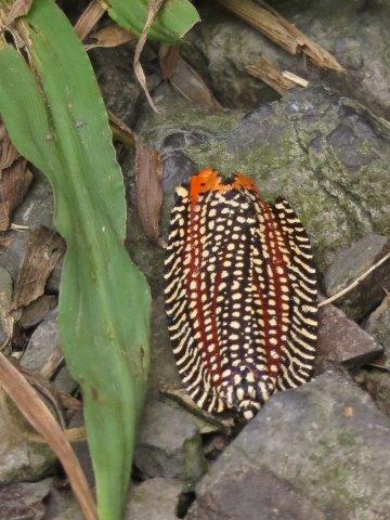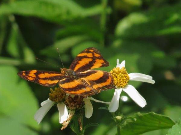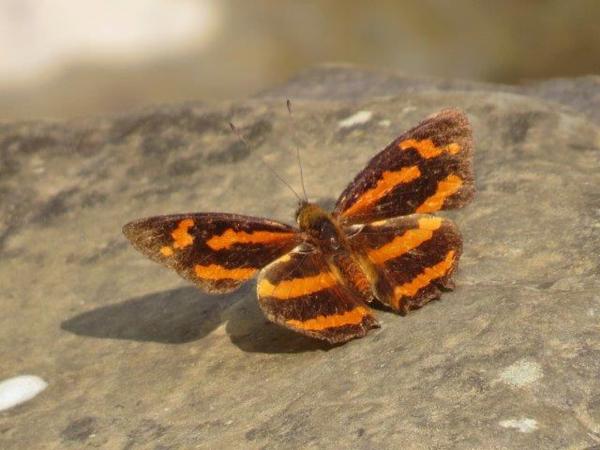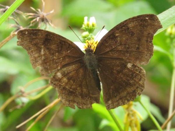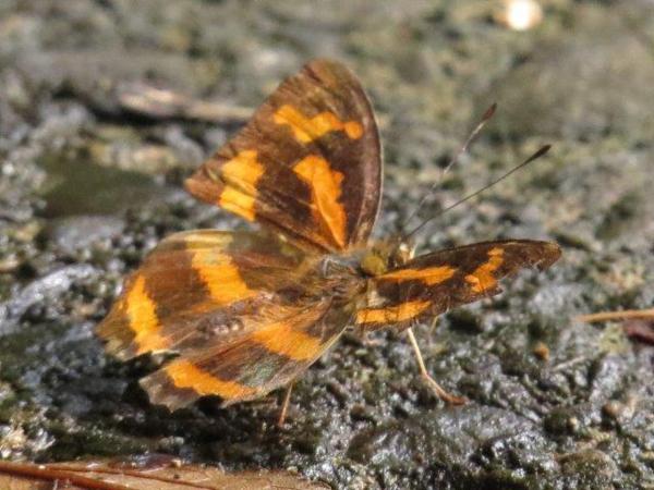 路途中聽到鳥聲,下車追尋鳥跡,遍尋不見鳥影,路邊道邊濕地上卻有橘褐色的花豹盛蛺蝶(姬黃三線蝶)。