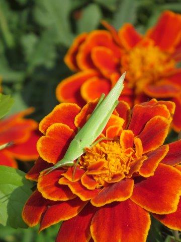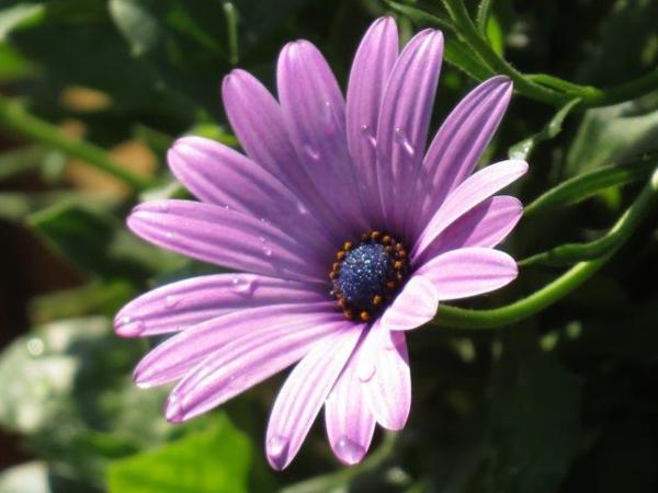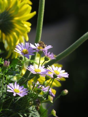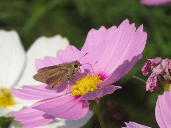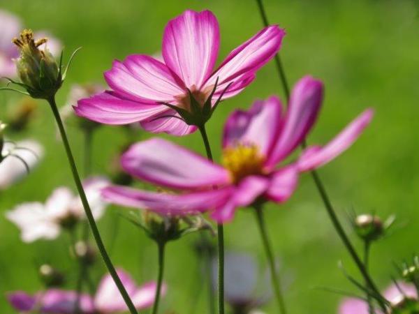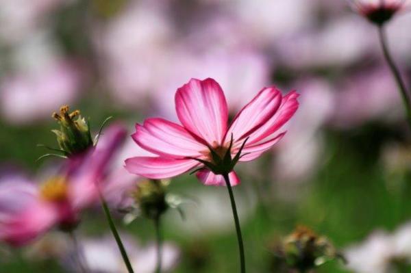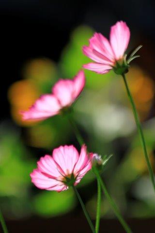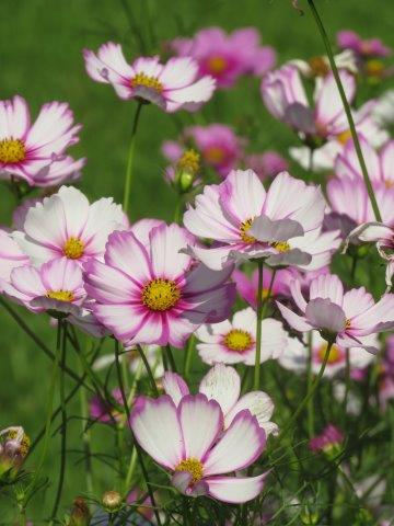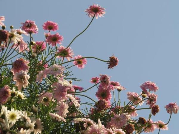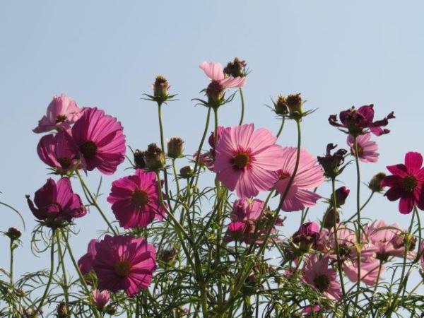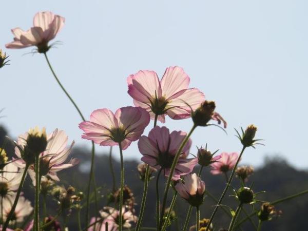花色多且飄逸的波斯菊,藍天下、逆光中花姿招展著