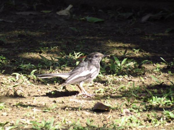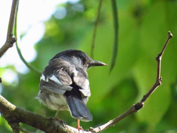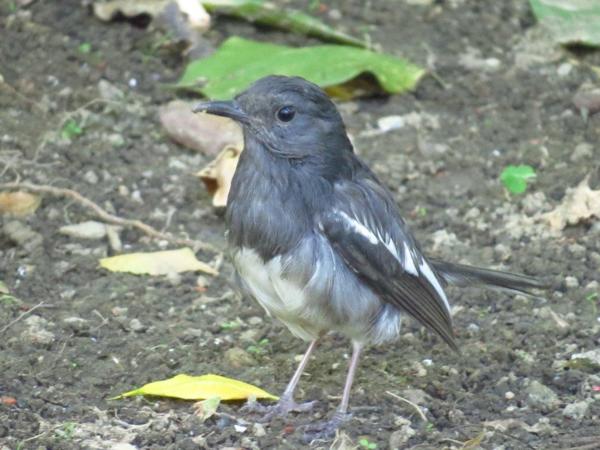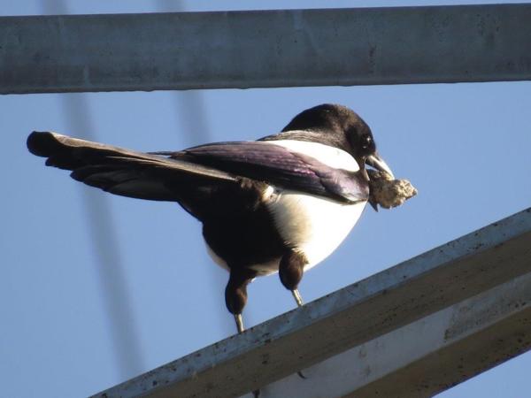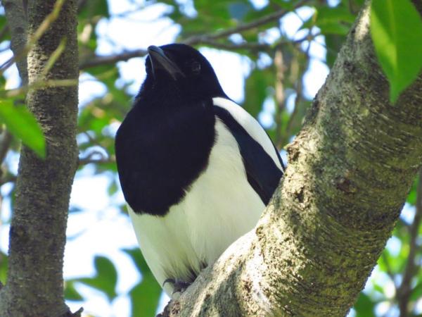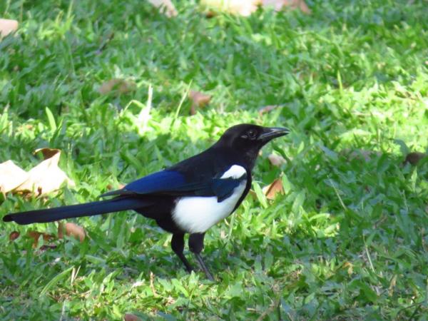 鵲鴝地上覓食著,而後見到松鼠和貓,趕緊飛至樹上