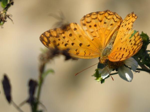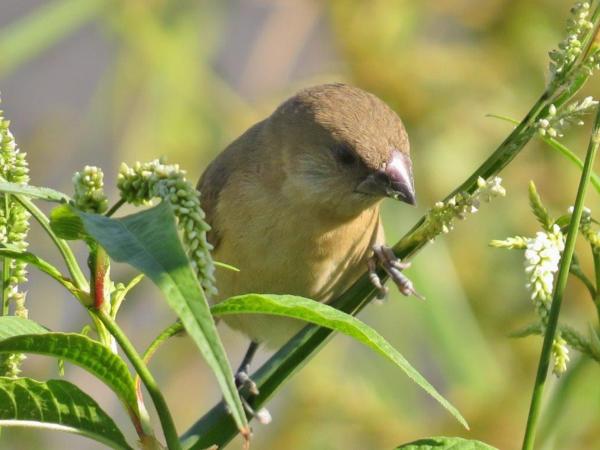 沼澤邊雜草枝上有麻雀和攀於草莖上專注覓食著草穗的斑紋鳥
