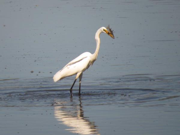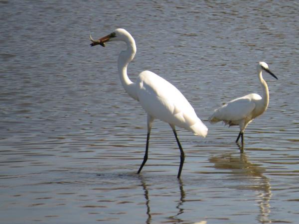 大白鷺則展現抓魚技巧,連抓到兩條魚,而小白鷺則白忙一場