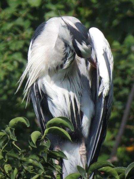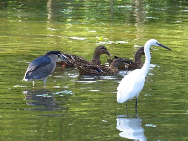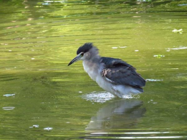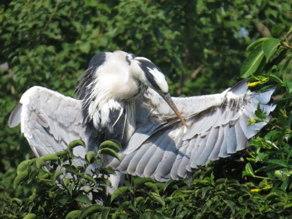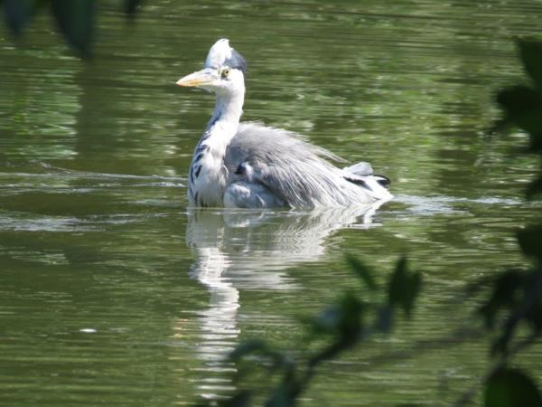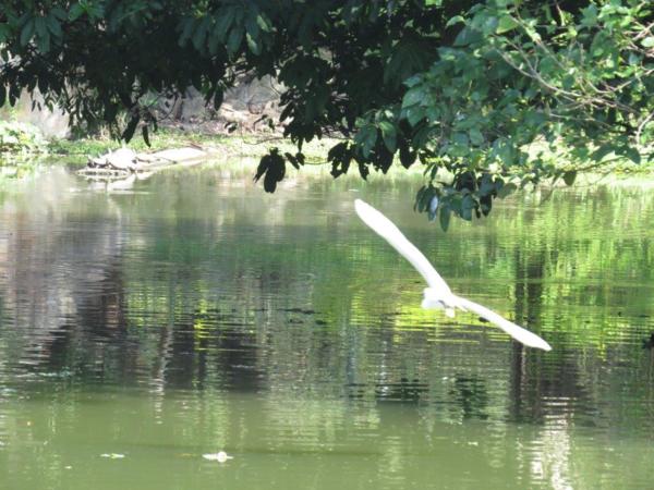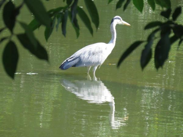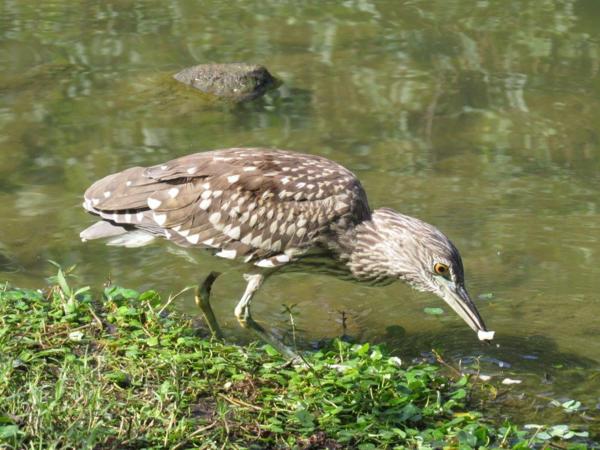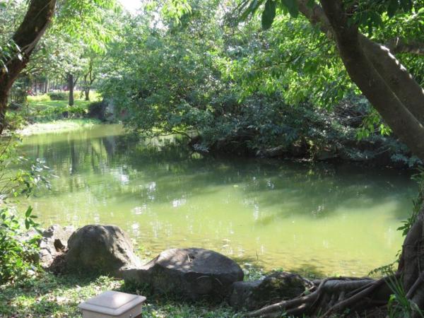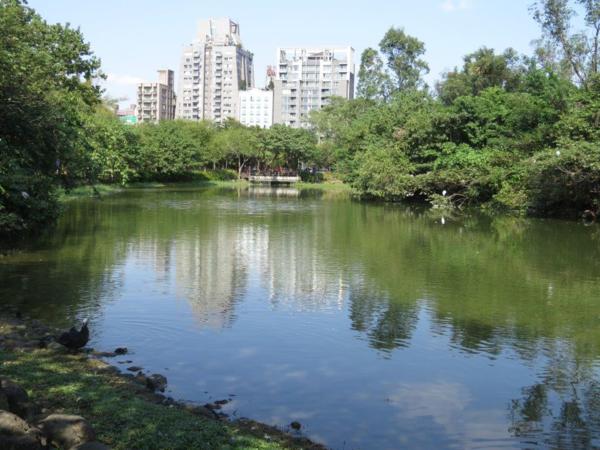 生態水池常有鷺鳥停歇於島上樹上,樹稍上的蒼鷺正展翅著,沒多久見其飛至水池內,而後似鴨浮於水面上,真令我大開眼界了!