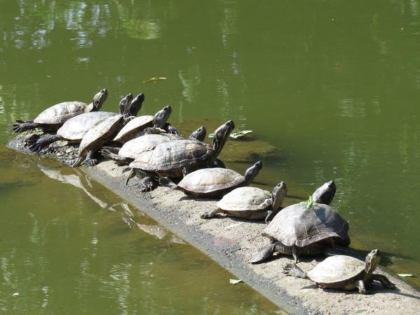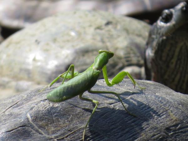 曬太陽的烏龜,奇特的是龜上竟有隻螳螂