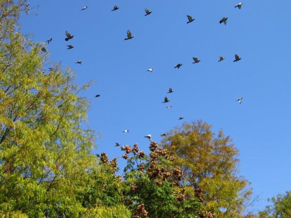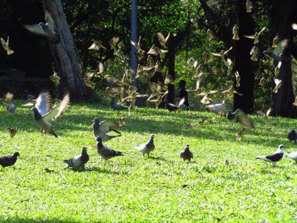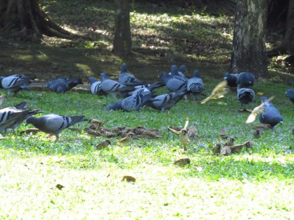 草坪上則有鴿子和麻雀集聚覓食,當人走過,多數雀就驚飛而起,真是狀觀!