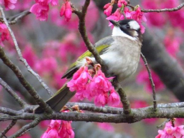 看得到櫻花樹上的綠繡眼,卻無緣入鏡頭,還好有白頭翁!