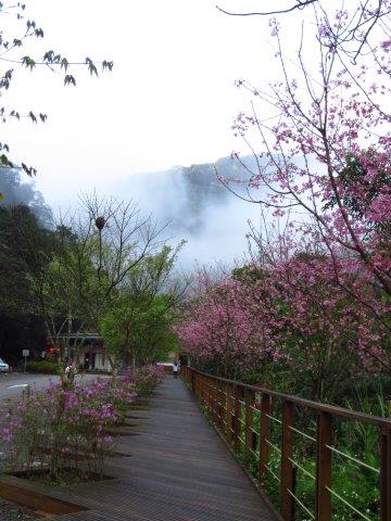 內洞小徑旁有一排的粉櫻(昭和櫻?)與山嵐