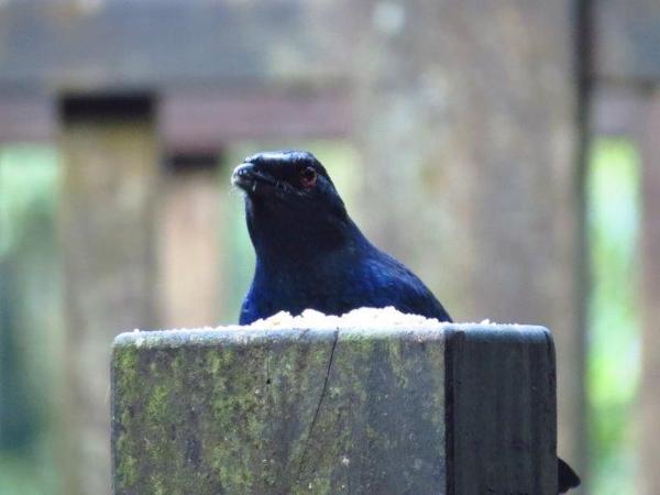 欄杆上滿是麵包屑,飛上飽餐一頓