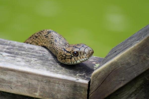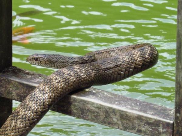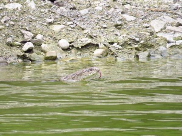 時,一條蛇竟攀上亭欄,遊客驚呼怕其是毒蛇,隨後它遊至水中上岸後藏於樹叢內,告知路過旅