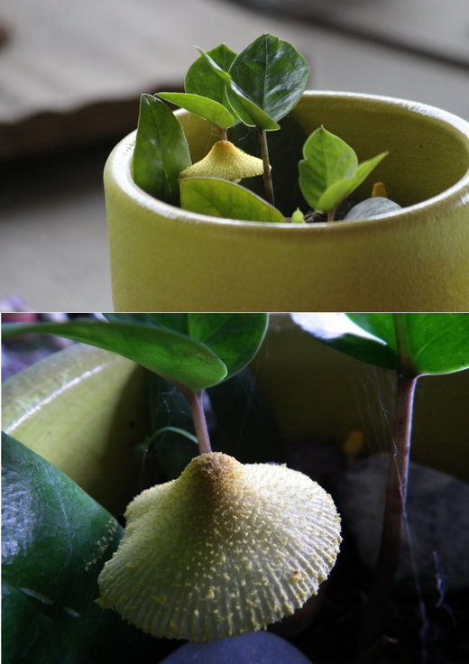 頂樓種花,買回來的花換盆,用了均是買了培養土。去年自己挿葉種金錢樹,亦是用了培養土栽種。金錢樹生長很慢,僅吐出幾葉新芽,不知為何從土壤竟冒出黃色菇來?