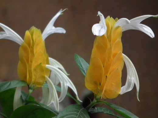 以往黃蝦花開花,花苞總是吸引了介殼蟲集聚,花兒總是沒多久就垂落。今年一發現介殼蟲,就噴灑有機藥,總算能看到開出白色芽的蝦花了。