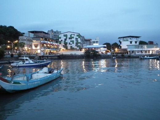 回程時,八里燈火已亮,餐廳燈光反應在水面上更是多彩,此時天空的藍,更是我最喜歡的顏色。屋子的不同的燈光,化映成光彩的水波搭配在不同的藍天下,處處看起來都是賞心悅目了!
