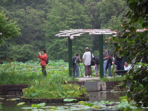 進了南海學園前的睡蓮池,看不到開了蓮花,猜想今年天氣較冷,荷花應還沒開。果然猜測準確,僅有零星幾花而已,雖如此,但照像的人也不少。