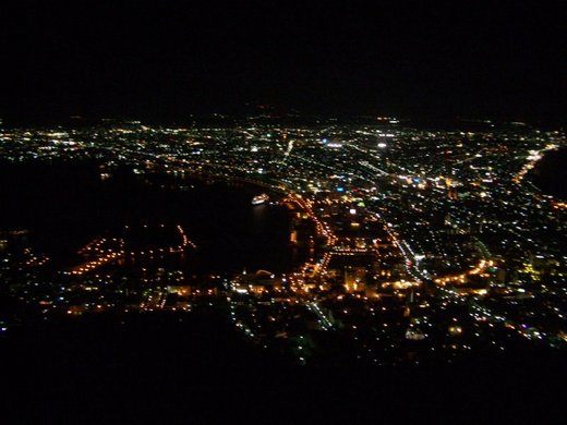 沒多久,地平線上開始燈火點點,但藍天下似乎還無法顯現其亮點,只好繼續等待著這壯觀的萬家燈火,想起當年在日本函館觀看夜景時,夜黑風大,與此景相比,眼前閃亮的燈火似乎也不比函館遜色。