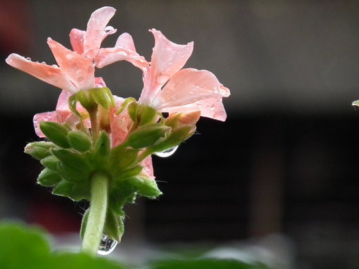 米雷颱風雖沒直接侵台,但其所引進的雨也不小,看著陽台上的花草沾掛著水珠,粒粒晶亮,天竺葵更顯透亮;雨中停靠天線的烏秋不斷的抖落其雨水,似乎找不到適當遮雨處,只好在天線上短暫停歇。不需羡慕鳥兒的自由飛翔,該慶幸自己有個遮風擋雨的家。