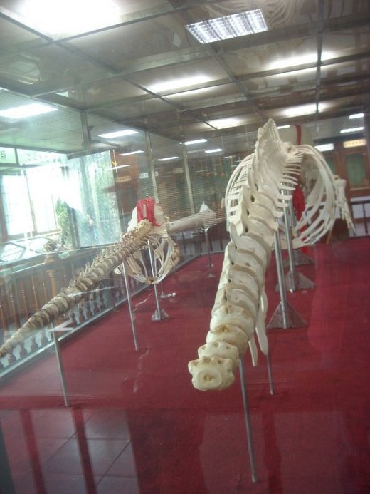 聽著導覽介紹四草由來:四草因過去盛產一種”草海桐”而得名,古名亦稱「北汕尾」-位於安平北方台江外海鹿耳門之南或南汕,原是內海,後因臺江泥沙淤積成四個湖泊,湖中長滿了草,故叫做四草湖。後來草湖漸漸淤積成了溼地,也就被簡稱為四草。每年有不少候鳥來此度冬,由於生態環境特殊,為野生動物保護區,種最多的紅樹林植物是海茄苳,另還有五梨跤和水筆仔等,濕地則有招潮蟹、彈塗魚。不是冬季,樹林上看到了都是白鷺鷥或夜鷺,湖上的竹坪養殖著蚵,湖邊上有腳踏車步道,框圍著網則是用望眼鏡頭賞鳥區。另還介紹的主祀鎮海元帥的大眾廟。離去前,還花了10塊錢去參觀鄰近的台江鯨豚館,內館展示著亞洲最大的抹香鯨骨骸標本,出來才知有四草生態的票,入館是不用再花錢了。