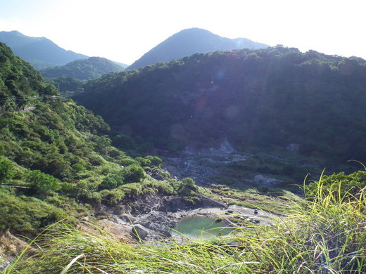 不知硫磺谷地點,於是問了龍鳳谷遊客服務中心志工,其位於磺港溪的上游,可看到紗帽山和五指山,是清朝時採硫之地,也是北投溫泉的源頭,有豐富的火山和沉積岩地質地形,志工說湖不是天然的,而是人工挖出來了。