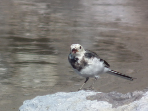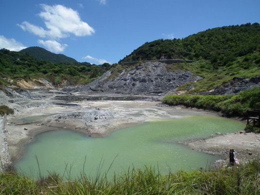 沿著階梯而下,是天母磺溪的上游,地熱噴孔多且白煙裊裊,可惜到處的管線條破壞大自然的美,翠綠的湖上蜻蜓四處飛翔或停歇,湖邊礦石上一隻小鳥似看著眼前的蜻蜓,卻把石頭上的小蟲給吃了。硫酸質的水色,顯現著不同顏色,有綠、有藍、亦有白如玉脂。