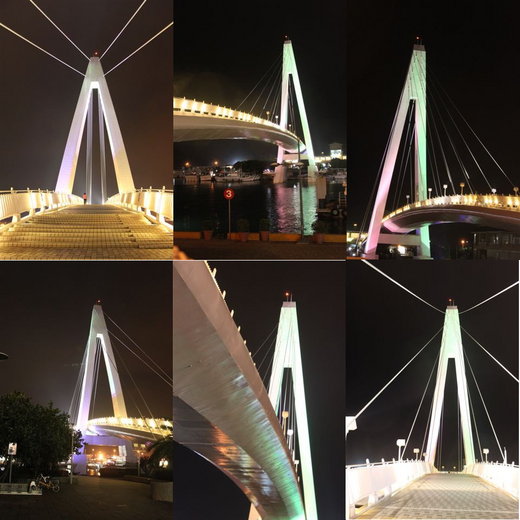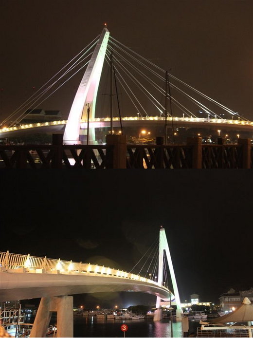 天氣不是很好,看不到黃昏夕陽雲彩。送老人家去油車回後,我們繼續前往漁人碼頭看夜景,海風蠻大,偶而夾飄著小雨,遊客少,碼頭內的商店生意看起來亦冷冷清清,唯一較有人氣還是碼頭上的橋,”橋”還是好攝者最佳的景點。