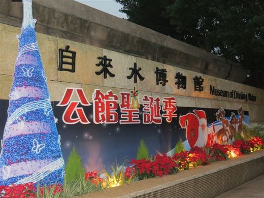 一入園區,就看到了持著"福到"的紅眼恐龍,親水池旁裝飾著一盆盆的聖誕紅,往自來水博物館走,途中有幸福鐘聲、巨大的聖誕樹和裝飾於前的麋鹿雪橇。三級古蹟巴洛克式風格的自來水博物館,的確是新人拍攝婚紗最佳景點。