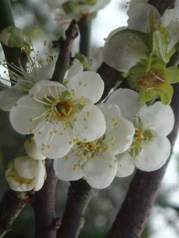 進去玫瑰園,有兩、參顆梅花正盛開著,有的則是開了零星白花,還有的長著不少綠葉,當然也有開長出的綠芽。雖然網上說冬天溫度過低,蜜蜂不會外出採蜜,但盛開的花還是吸引著蜜蜂採蜜著。我抬著頭看著串串白梅,找尋著美麗花姿,享受著飄傳來的花香,心裏暗難著天氣不夠晴朗,否則藍天下的梅花就會顯得加出色了。