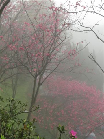 花卉試驗中心臨近加油站一大片的緋寒櫻,花期將過,已呈凋謝狀。但其它地方仍可看到少數山櫻花蹤。無意中走進去逛逛,卻碰到茶花展覽-外面不少茶花大盆栽,進去裏面更有如茶花大觀園,不同茶花品種在雨珠搭配下,各自呈現不同風韻與嬌美。