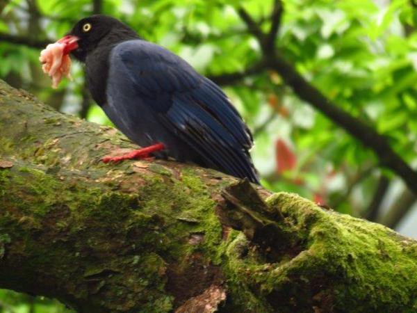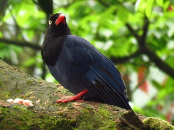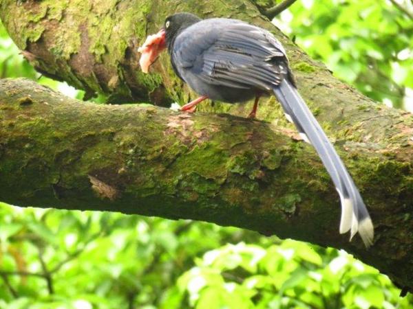 此時四、五隻藍鵲飛至,撿拾食物飛至樹上,一口口啄食著。而後,有人帶一袋肉來,她和我說:她常買肉來餵食藍鵲,藍鵲曾從她手中將肉啄走。