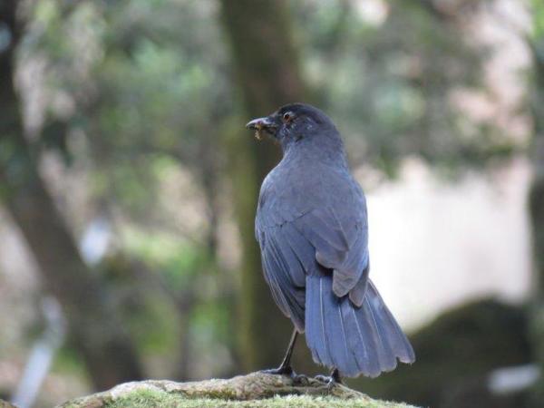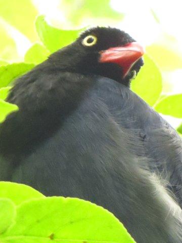 於是,一場藍鵲補食記上演,眼見它從樹上飛下,停於椅背上,一會兒,就將所有肉全含於嘴上,再飛至樹上,將肉放於樹上,再慢慢啄食。