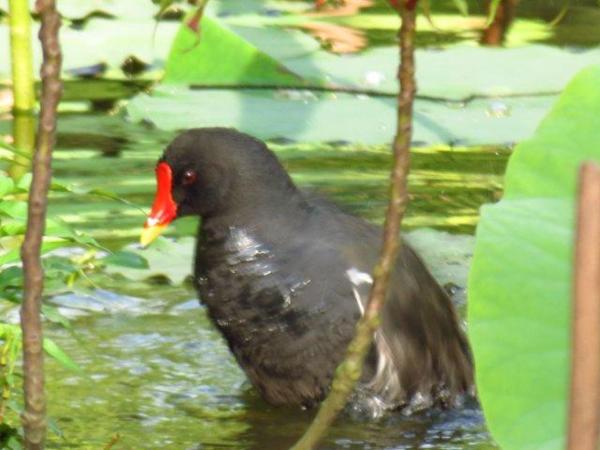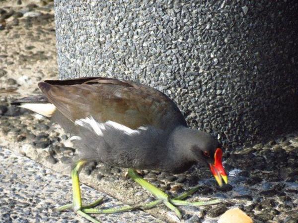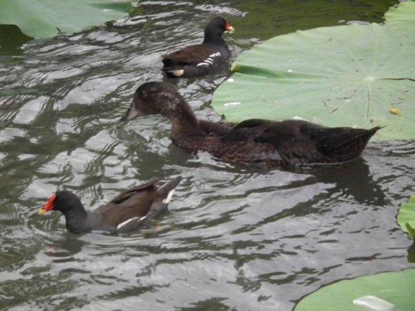 倒是紅冠水雞仍可在池裏洗澡,甚至上池邊岸和麻雀們搶叼食著白吐司。