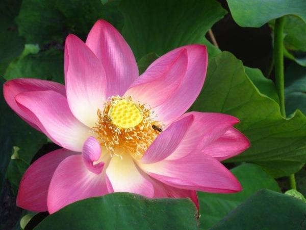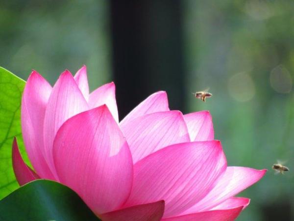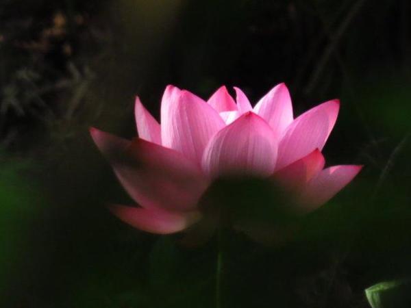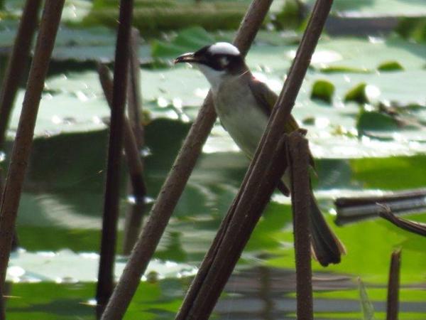 抵達時,差不多是六點以後,荷花瓣上已無晶亮水珠,僅有吻蕊的小蜜蜂。盛開荷花並不算多,也因不是盛開期,好攝者也不多,粉紅或豔紅荷花在一大片綠意中就特別醒目了。總是逛了荷花池一圈,欣賞著不同荷花姿色,和在光線下透亮的花瓣,及池裏水雞並補抓飛至荷梗上的白頭翁或麻雀。