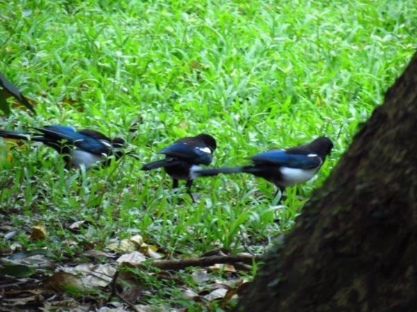 隨著鳥鳴聲,走進了植物另類體驗園,那兒是松鼠和鳥兒聚集地,雖都沒見到松鼠,然看到黑冠麻鷺和一群喜鵲在綠地上覓食著,樹上有樹鵲和五色鳥。第二次前往則不見任何鳥,倒是有一隻”裝備齊全的大砲”在那守候著一隻叫聲奇特的鳥。