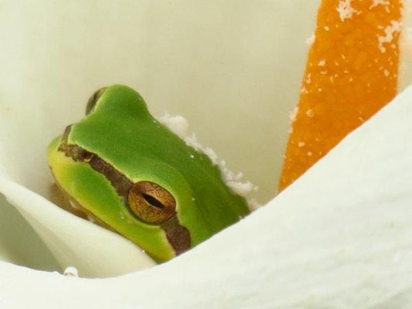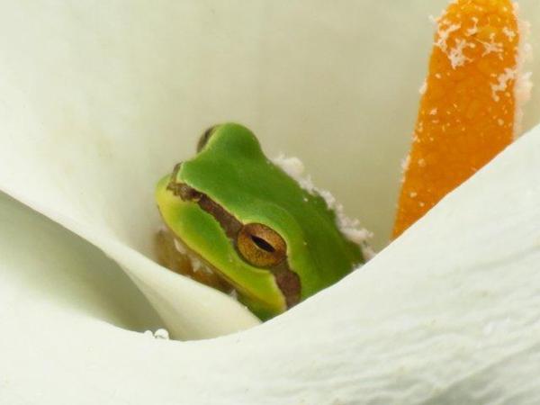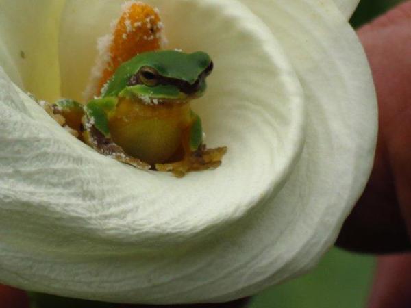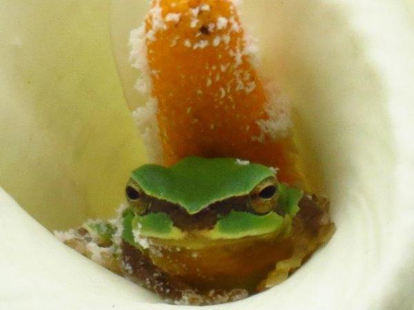 進入海芋田裏,慢慢尋找這翠綠色樹蛙,總算老天不負有心人,找到兩、參隻小小樹蛙藏於海芋花蕾內,蛙身上還沾了不少花粉,還有一隻抱在葉子上。
