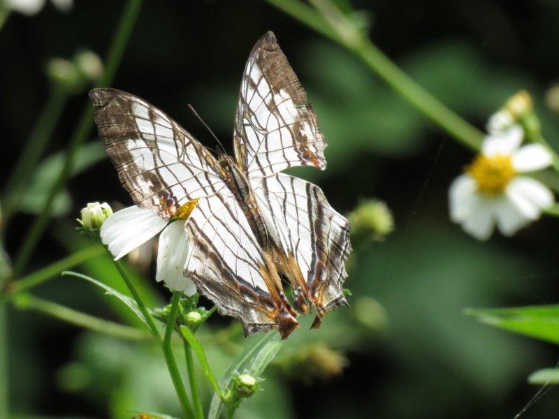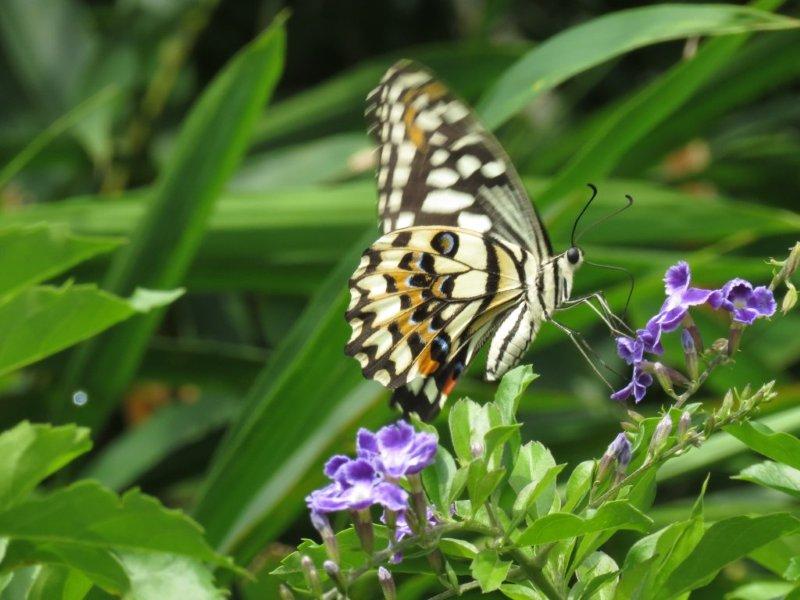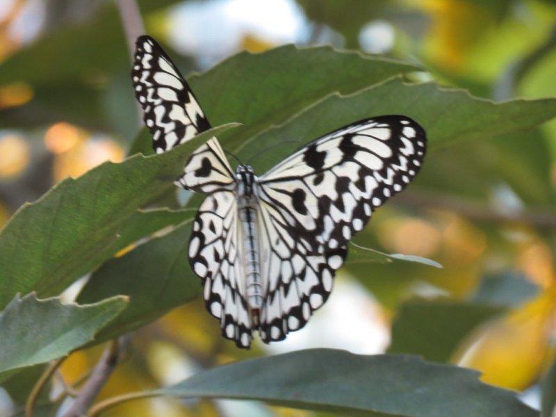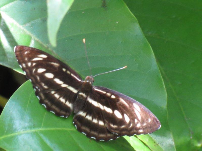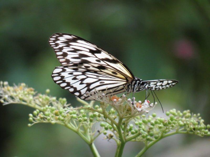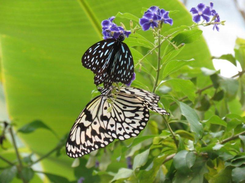 雨天去動物園的昆蟲館,發現此為蝴蝶的桃花源,有很多外面很少見到的大白斑蝶和枯葉蝶,大白斑蝶有大有小,往往兩三隻大斑蝶吸蜜於同一金露花上,或者飛至和青斑蝶一起。