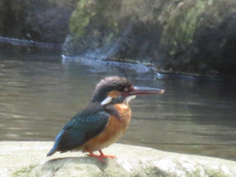 走一小段,以為走錯路了。回頭走上溪流上的步道,往溪流一看,看到了兩隻翠鳥,但一會兒就飛至遠方的石頭上,拉最長鏡頭,得到了還是模糊翠鳥。但溪步道路很短,若要沿溪流走,就得涉水而過,但溪上石頭有青苔,不想有意外發生,又回到小馬路。