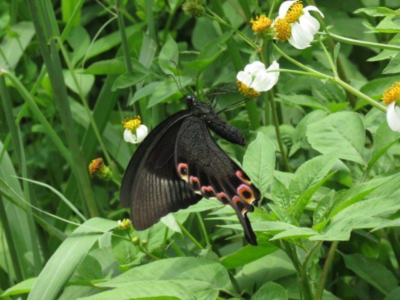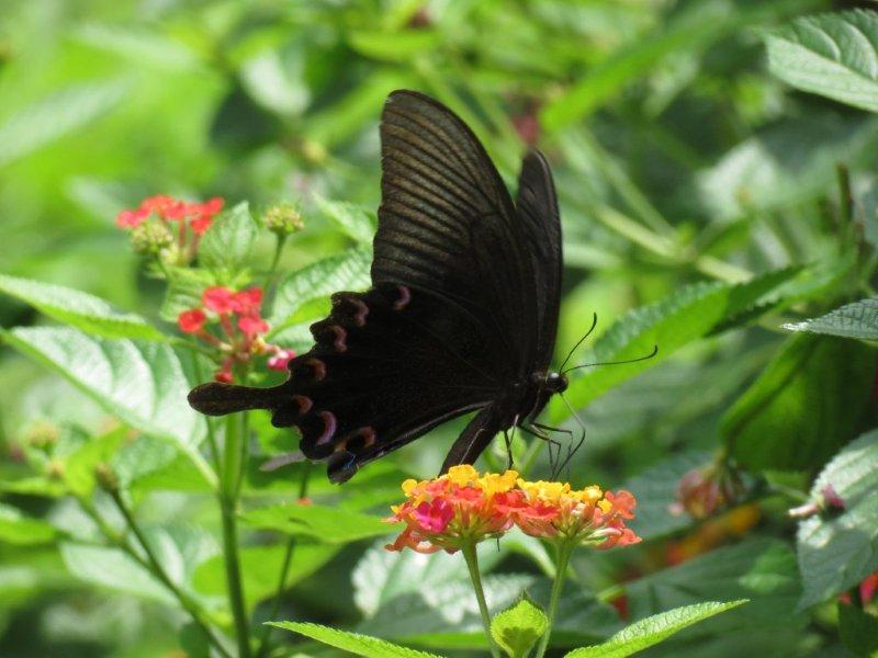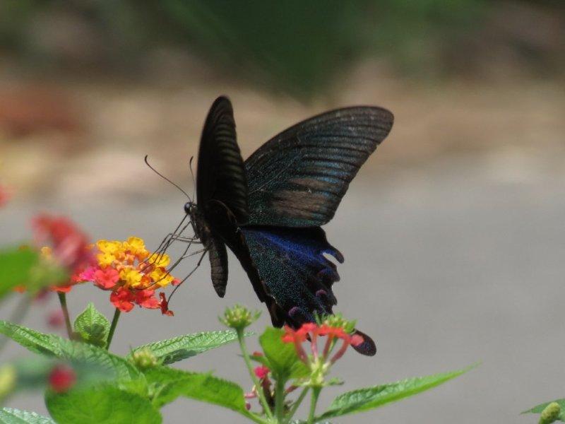 還有三四隻鳳蝶在馬櫻丹花上吸蜜著,翅膀不停拍動,亦不停地轉換花朵。如此的鳳蝶機緣當然不想錯過,但我的反應速度太慢,硬體配備亦不夠高級,對不到焦且模糊是常有的事,偶而以為應有不錯景色,結果大都時候都是白忙一場。雖如此,還是有瞎貓碰到死耗子,總有幾張自我感覺良好,記錄著這出遊風景。