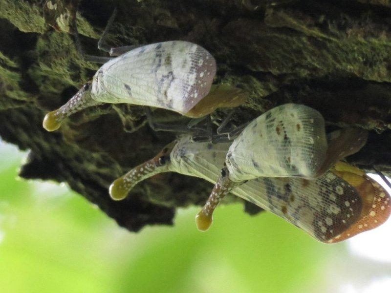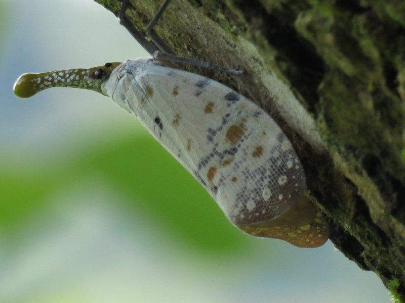 總算走到了內溝溪生態館,在館內看了照片後,就繼續往康樂街走。不久,看到一顆樹旁,有人在拍照,好奇一問的才看到這保育昆蟲-渡邊氏長吻白獵蟲又稱渡邊氏東方蠟蟬,網上資料:其生活史及相關習性亟待研究,出現於中低海拔的山區,成蟲通常棲習於烏桕的枝幹上,但若蟲的生態與棲地則尚未得知。