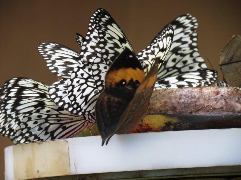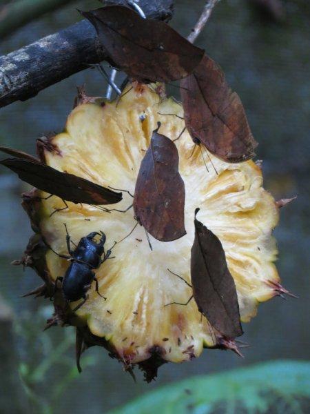 動物園準備的水果盤上,則有一群大白斑蝶和枯葉蝶們停歇,不單蝴蝶喜歡水果(看到了水果有香蕉、鳳梨和蘋果),甲蟲和枯葉蝶亦停於鳳梨上。