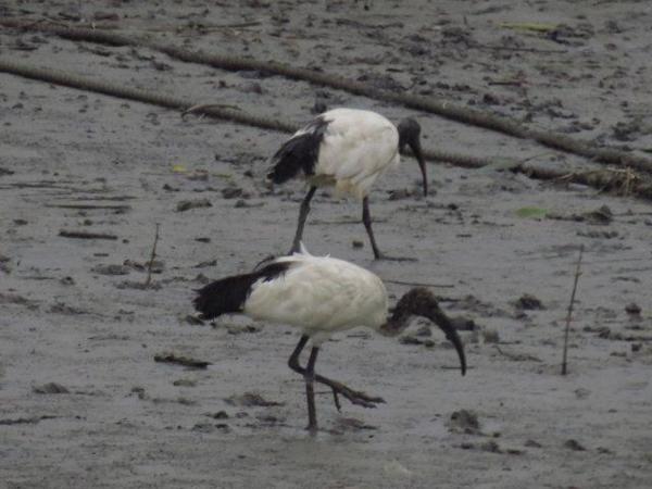 於是先前往關渡宮周遭濕地,只見兩、三隻埃及聖䴉在那覓食著,不見其它候鳥。再往紅樹林走,魚船碼頭處有一公一母夜鷺停歇,步道對面的樹叢則棲息著斑鳩、白頭翁,一群綠繡眼飛至紅樹林內,而褐頭鷦鶯則躲藏於草叢中。