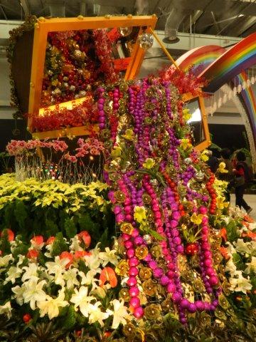 立於走道中間的大型的紅色寶盒裝了晶瑩剔透各色珠寶配著五彩旋轉燈光,四周花海,瓊瑤璧珞,確如進入了寶盒秘境。