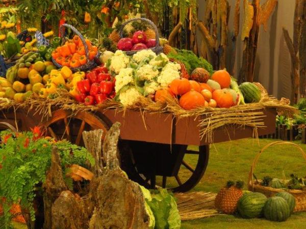花果之戀:以牛棚、牛車組合表現出農村的豐收,且與繽紛花草交織,顯現出花與果戀曲。