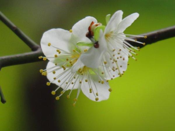 如所預期,清香的白梅正盛開著,吸引著蟲兒和蜂兒,看到了三顆梅花分散在不同點,樂活花園處的梅花最雄偉,白雪花片散於其附近,在那不僅看到白雪花飄落,且花香撲鼻。記憶中,廣場有一大片梅花園,尋到才知此種的是宮粉梅,但仍未見其花苞,看來其花期應與櫻花相同吧。