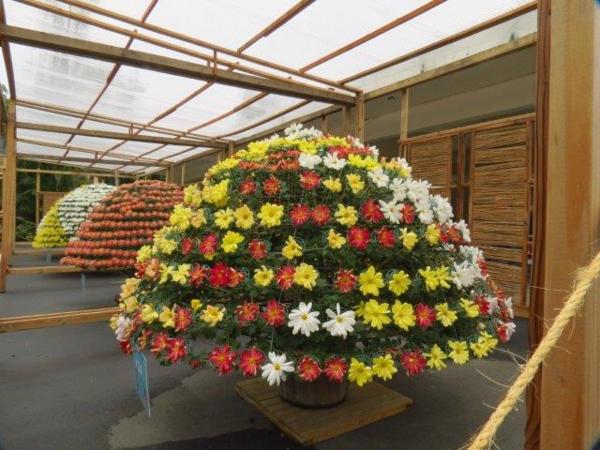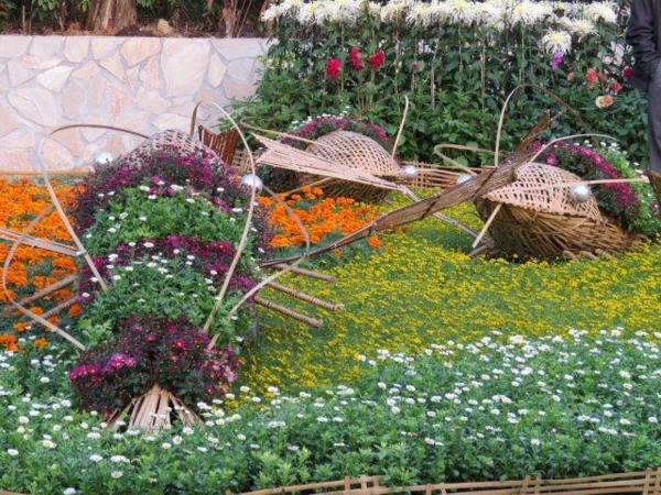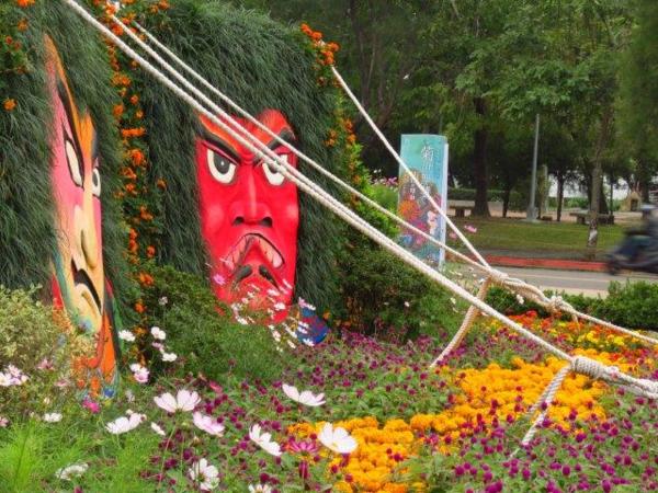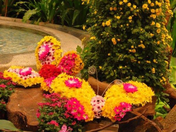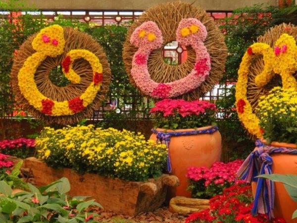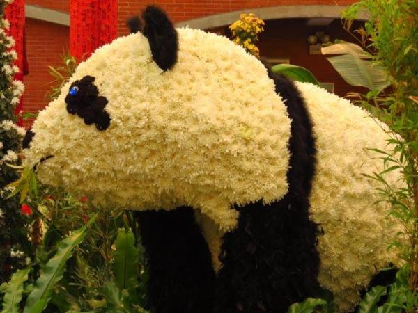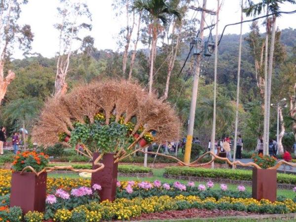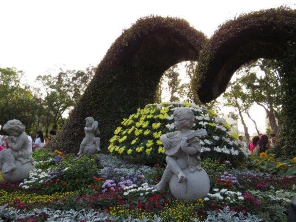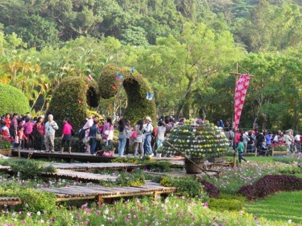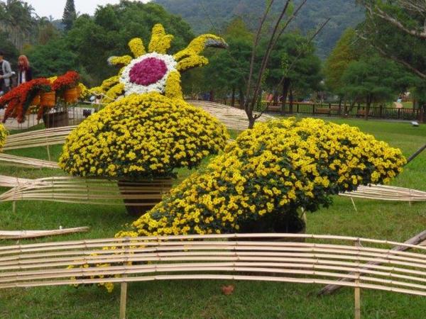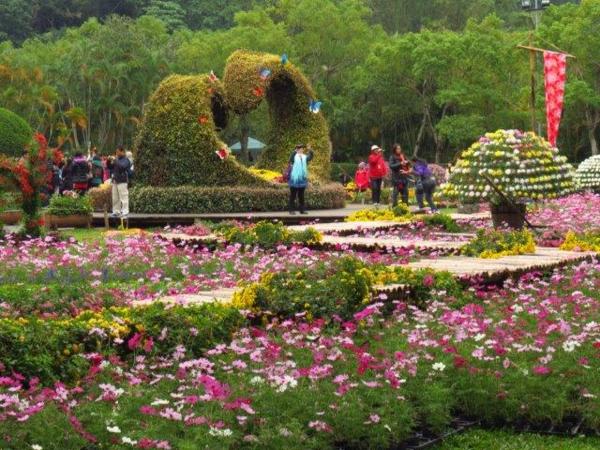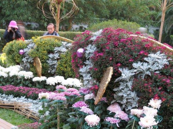 園藝展覽館的彩菊飛舞以多樣顏色、鮮艷的菊花裝飾今年的金蛇年,不同顏色菊花搭配樹枝、漂流木、陶甕等營造出彩菊飛舞。花裝飾蛇外,有蝴蝶和貓熊”圓仔”,其人氣之旺引來多人排著和其照像。
