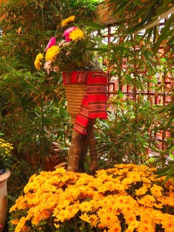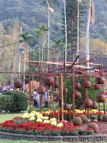在西式庭園裏看到了很多竹製品,垂吊著竹編不同圓球,最醒目的是用竹掃、木籐與菊裝飾,此區表達的是竹輝光影。